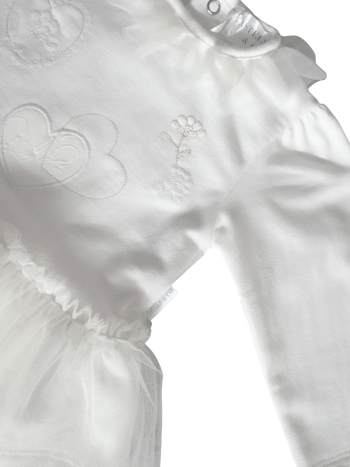 A stunning Ivory leggings set for little girls by Portuguese brand, Pastels & Co. Made in a soft cotton jersey with fun tulle trims. The long-sleeved, tunic top with ruffle tulle collar and covered peplum hem and delicate heart embroidery, popper fastening up the back. The matching ivory jersey leggings with tulle ruffles and bow on the ankles. Elasticated waist to ensure a comfortable fit and feel. A lovely set easy to wear and comfortable.