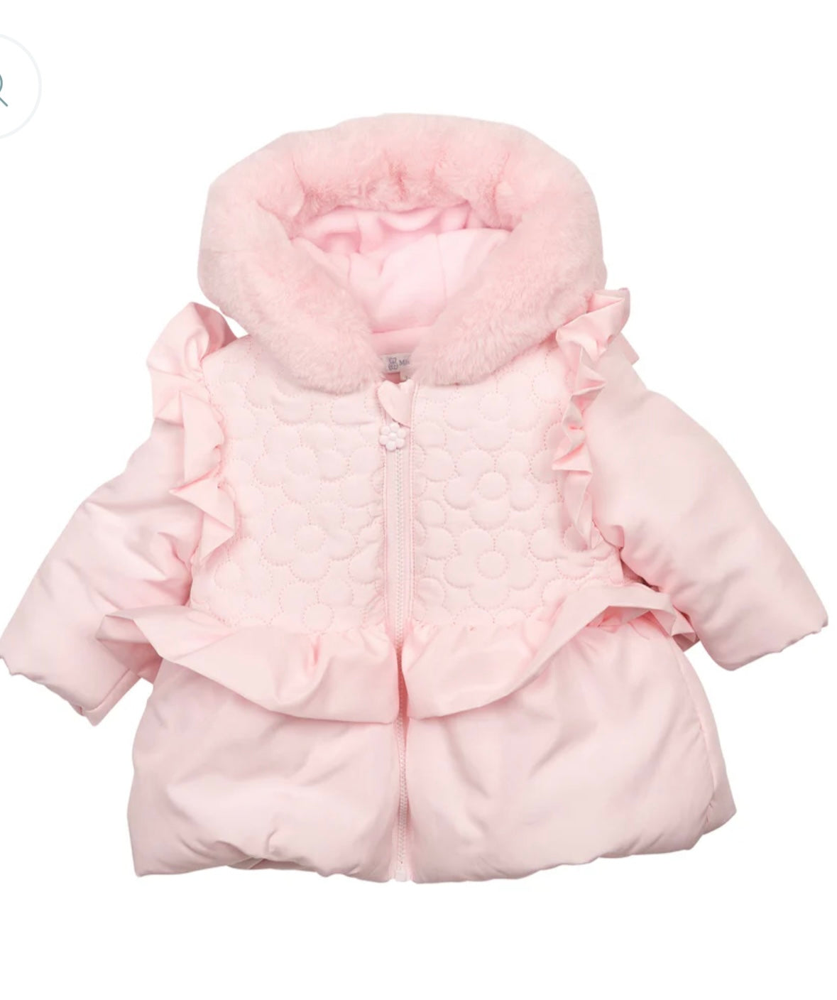Girls pink hooded coat by Mintini, made in soft and smooth quilted polyester. With a pink fur hood trim, this padded coat has pretty floral embroidered pattern with frilled peplum style trims. It fastens with a zip on the front and has a soft lining.