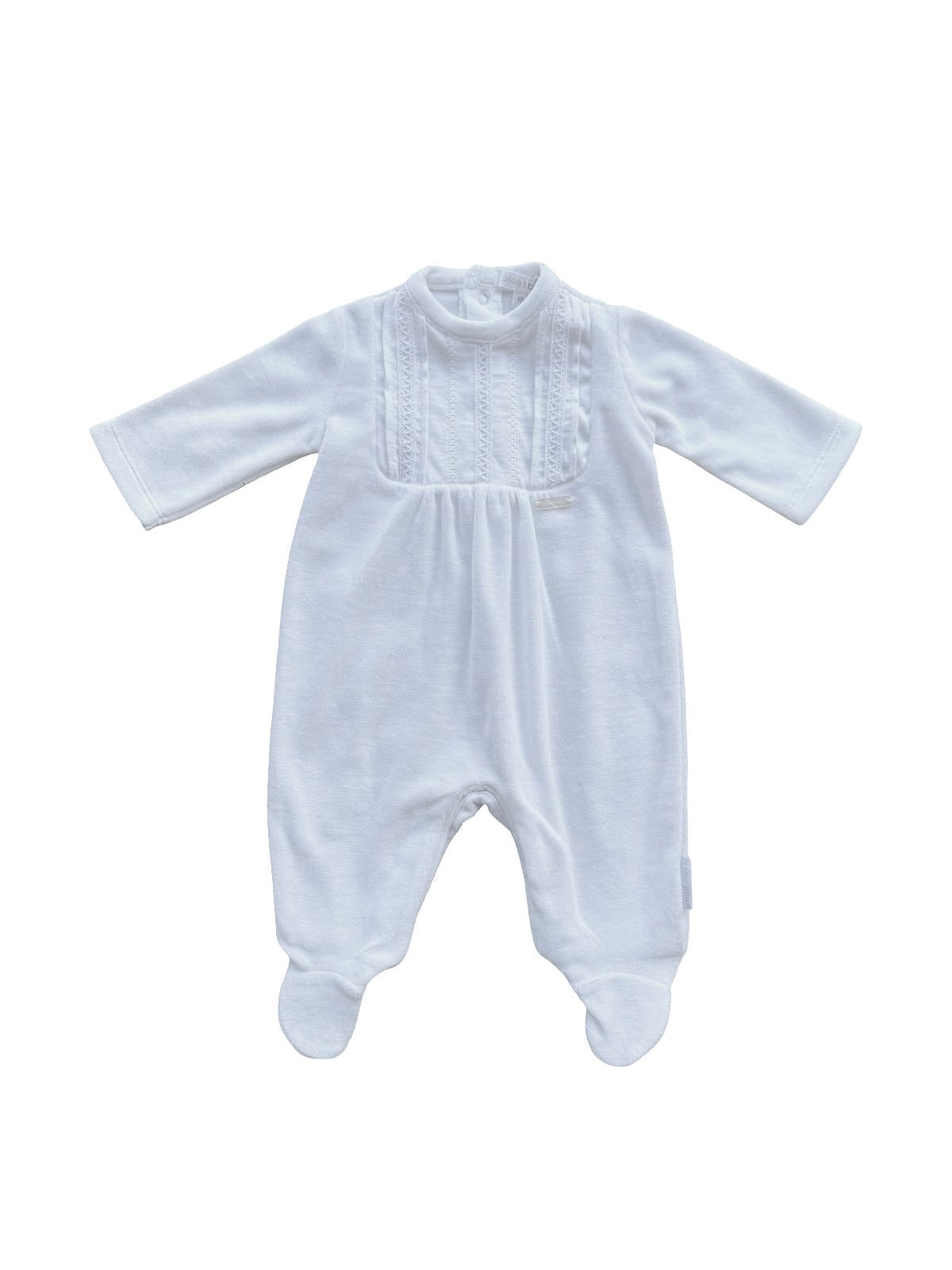 Lovely white belour babygrow for baby boys and girls from Bluesbaby. Made in soft cotton velour for gentle comfort against delicate skin with matching cute logo embroidery. The babygrow has embroidered bib detailing and popper fastenings to help with dressing.