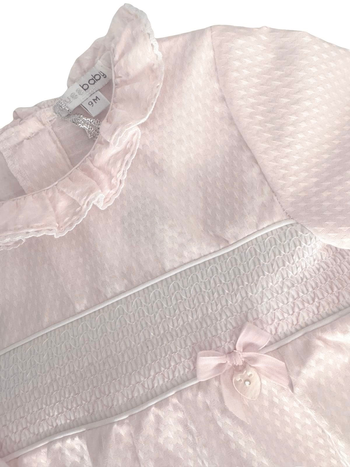 A lovely pale pink legging set for little girls by Bluesbaby, made in soft cotton. The pretty top has delicate smocking embroidery on the front and ruffled collar with gently elasticated cuffs. Completing the sweet look, the leggings have dainty satin bows on the ankles and a gently elasticated waistband for a comfortable fit on little tummies.