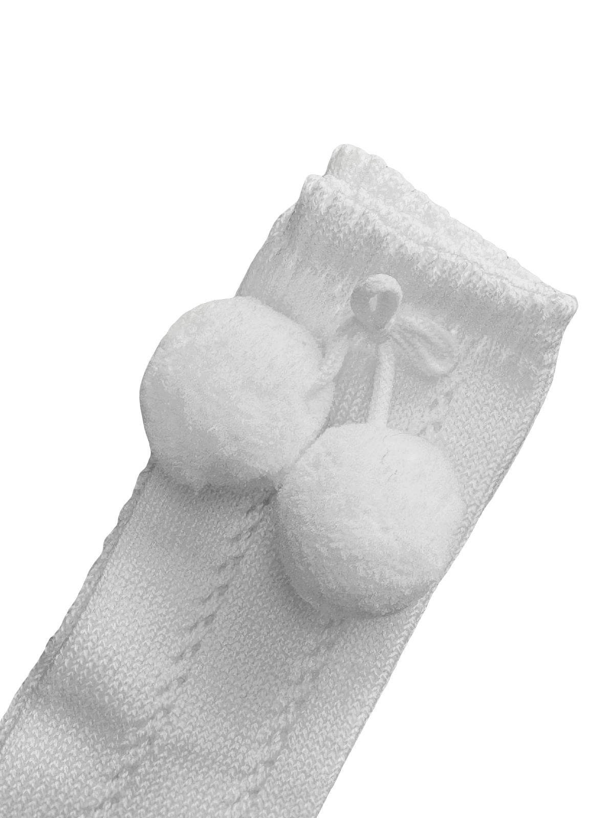 White knee-high pom pom socks for boys and girls by JC socks, knitted in a soft cotton blend. They have a delicate openwork pattern with a double pom pom on the side, making them a charming addition to an outfit.
