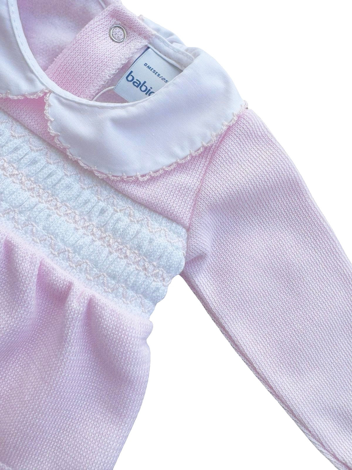 A lovely pale pink two piece set for little girls by Babidu, made in soft, cotton jersey. Fastening with poppers on the back, the top has a smart collar, trimmed with picot-embroidery, and smocking detail on the chest. The matching trousers have cosy enclosed feet and a gently elasticated waistband for a comfortable fit on little tummies.