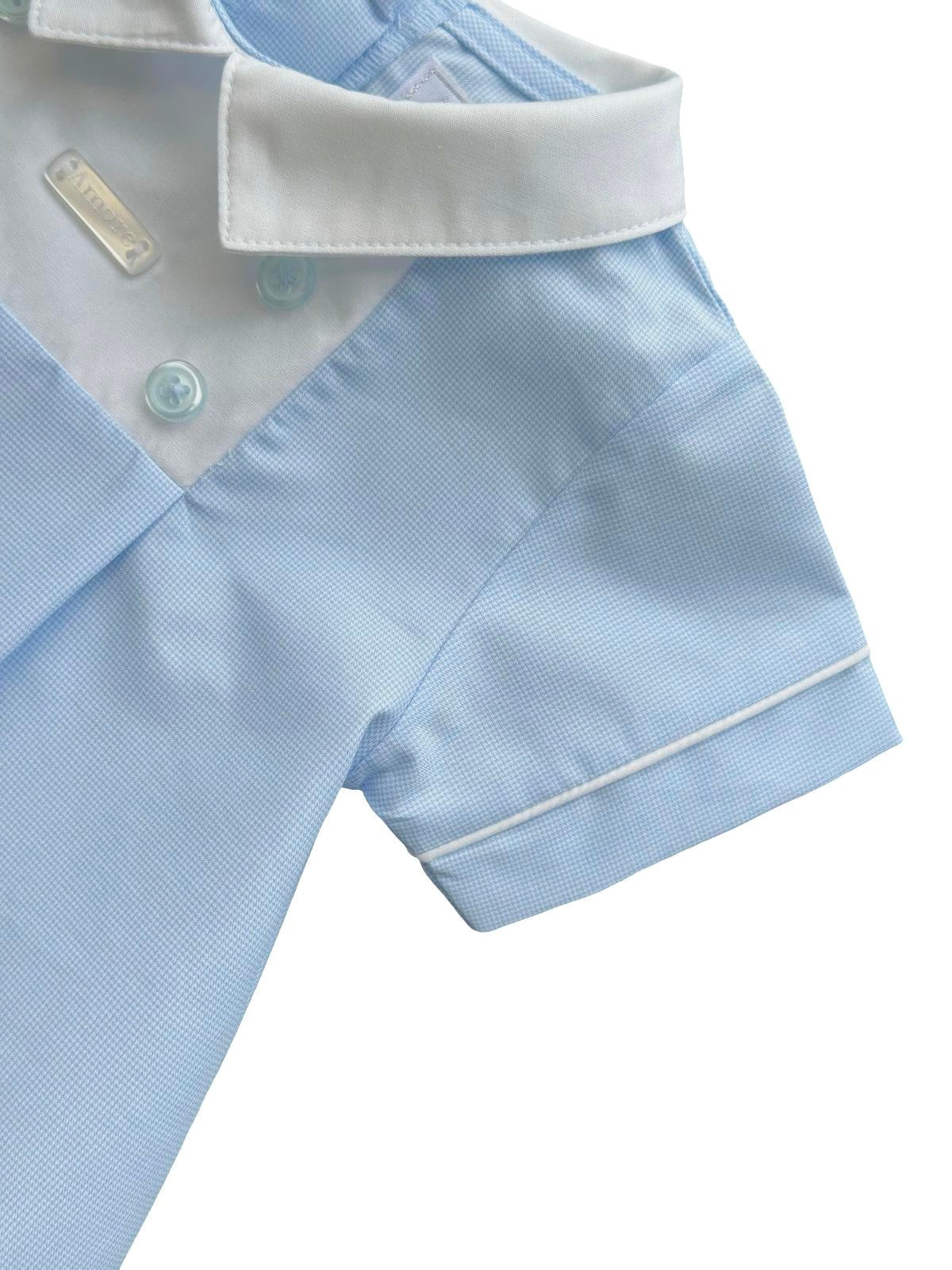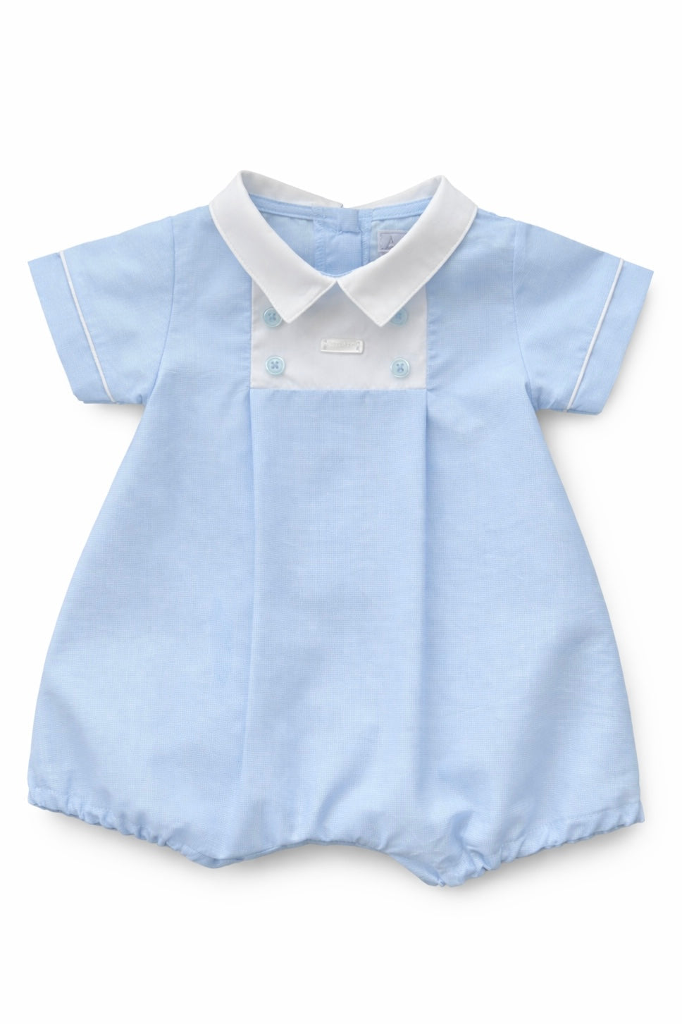This lovely pale blue, romper for baby boys by Amore, is made in soft cotton. Comfortable against delicate skin, it features a white Peter Pan style collar and panel front with delicate contrasting button detail. There are button fastening on the back and poppers between the legs to help with dressing.