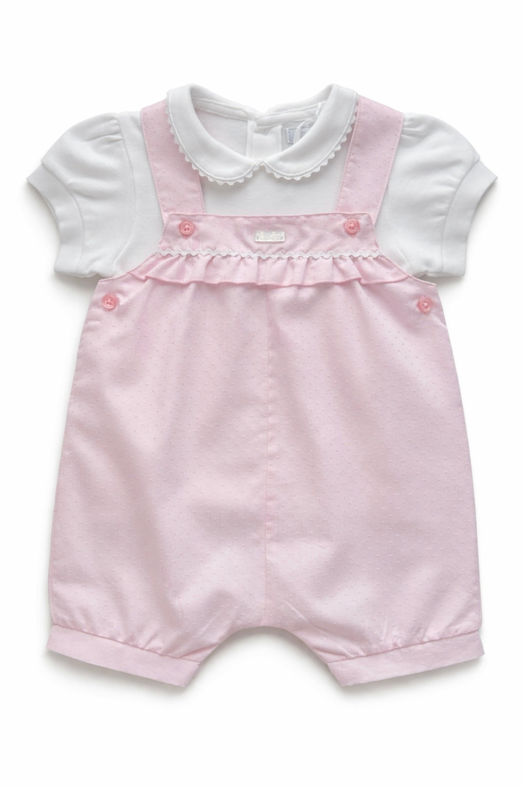 Summer set of white top and pink dungarees. The white short sleeved blouse has cute rounded collar with scalloped edging, button fastenings to the front and sides. Dungarees are short legged in fine pink pique with cute ruffle trim and embroidery to the front chest. Colour contrasted button fastening at the shoulder straps and both sides and popper fastenings between the legs.