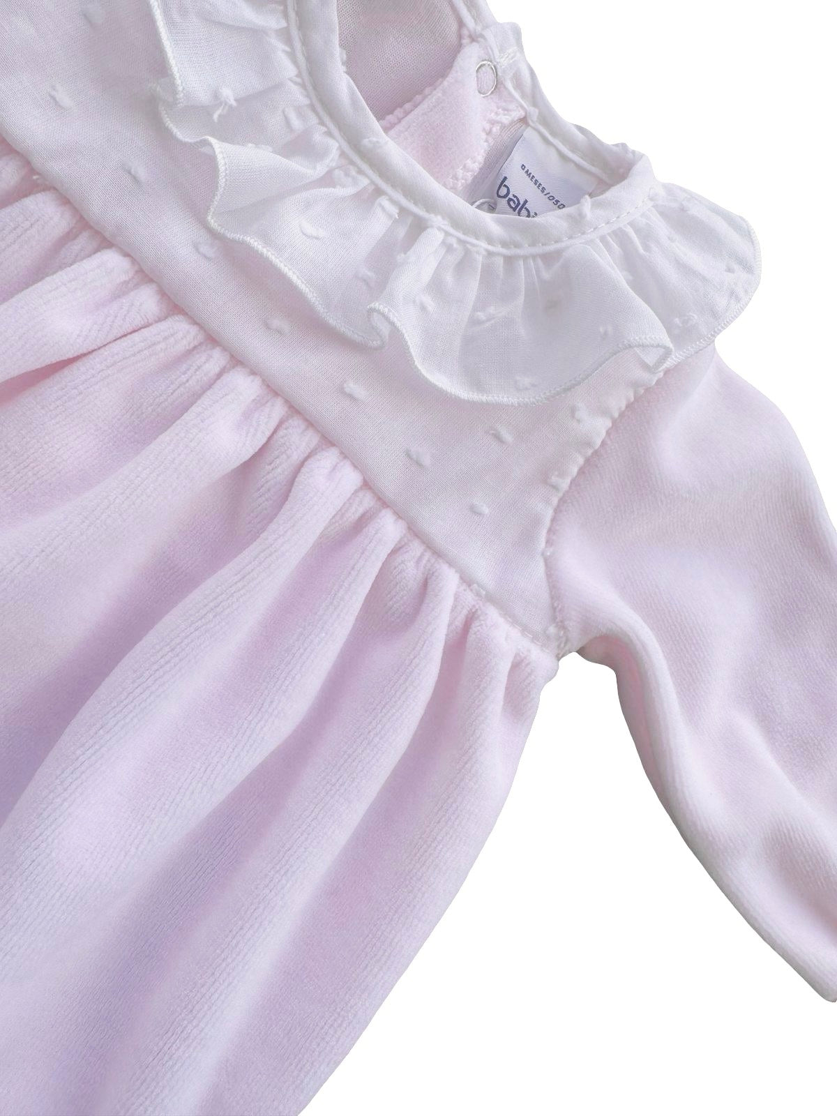 This pale pink babygrow for baby girls by Babidu is made in super soft cotton-blend velour. Styled with a ruffle collar and panel on the bodice in white plumeti voile, with gently elasticated, frilled cuffs, it fastens with poppers on the back and between the legs for easy dressing.