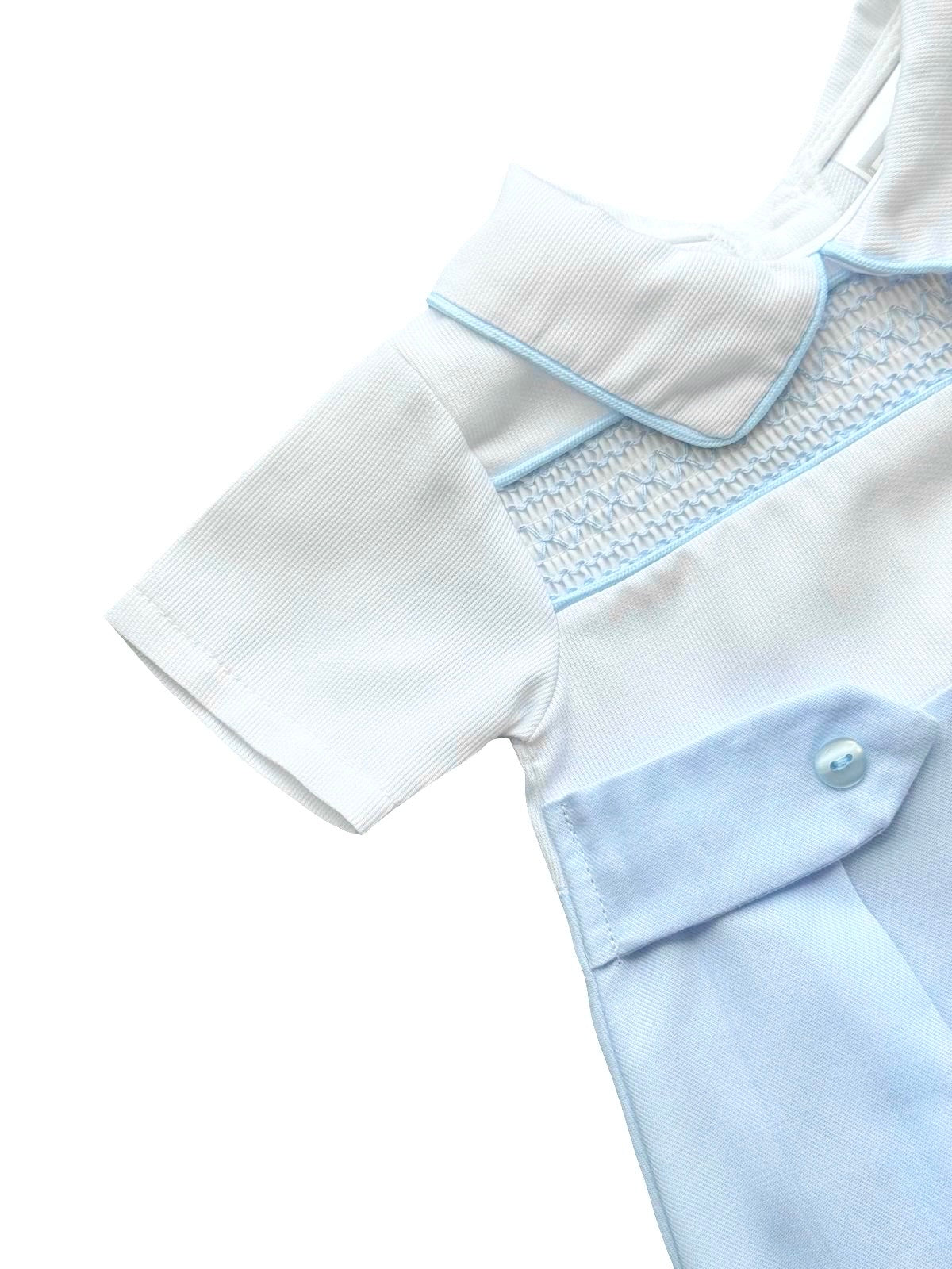 Adorable pale blue shortie for baby boys from, Pex, made in lightweight cotton. Traditionally styled, this sweet romelet has a hand-smocked panel on the front, with a delicate pleated trim and blue trim on the rounded collar. Still easy to dress, there are button fastenings on the back.