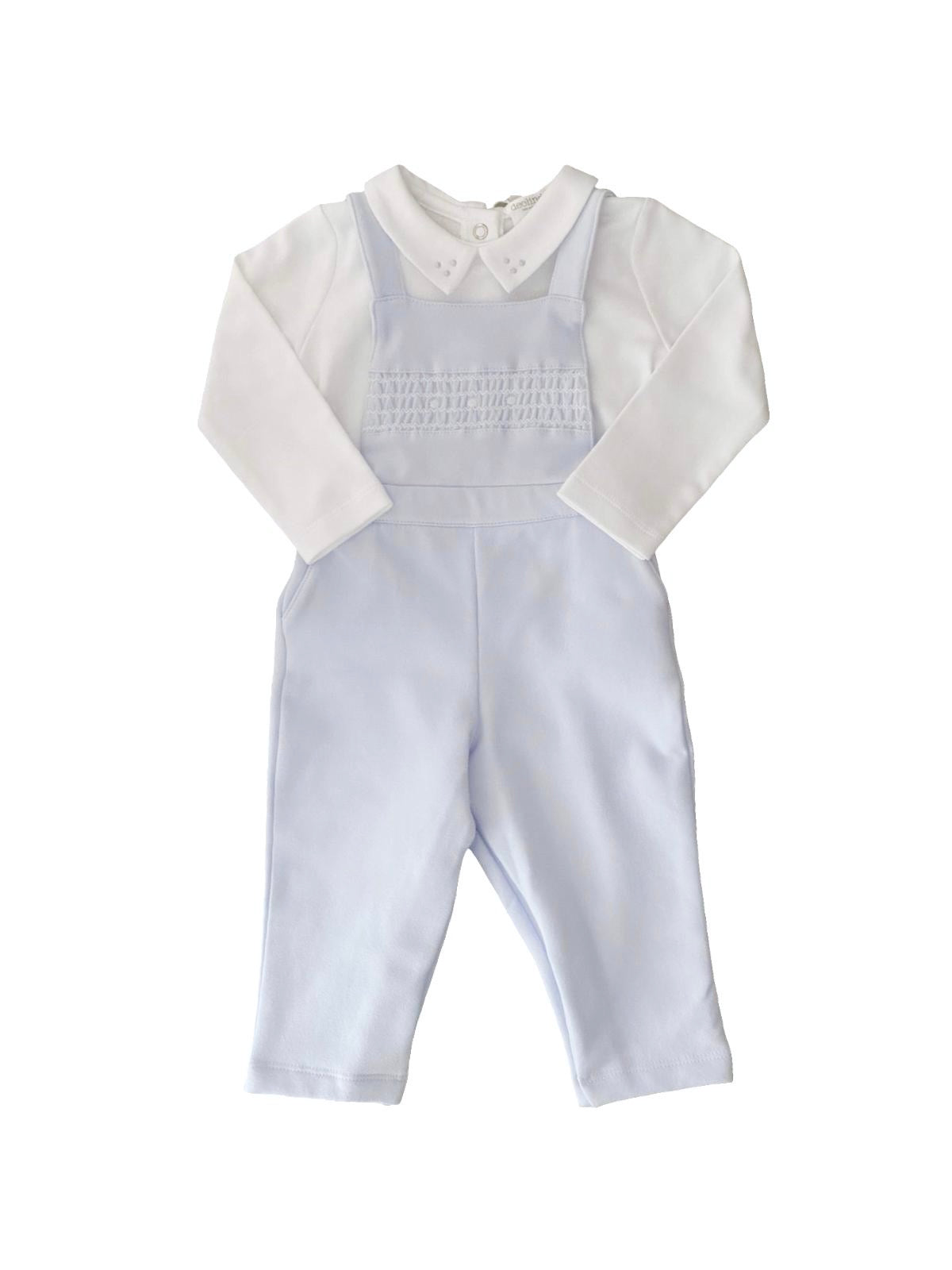 A charming blue and white dungaree set for little boys by Deolinda. Woven in lightweight cotton jersey, the white long-sleeved shirt has a smart pointed collar with pale blue dot detail and popper fastenings on the back. The pale blue dungarees have a delicate hand-embroidered smocking panel on the bib front and button-fastening straps on the back. The waistband is elasticated on the back for comfort and easy movement.